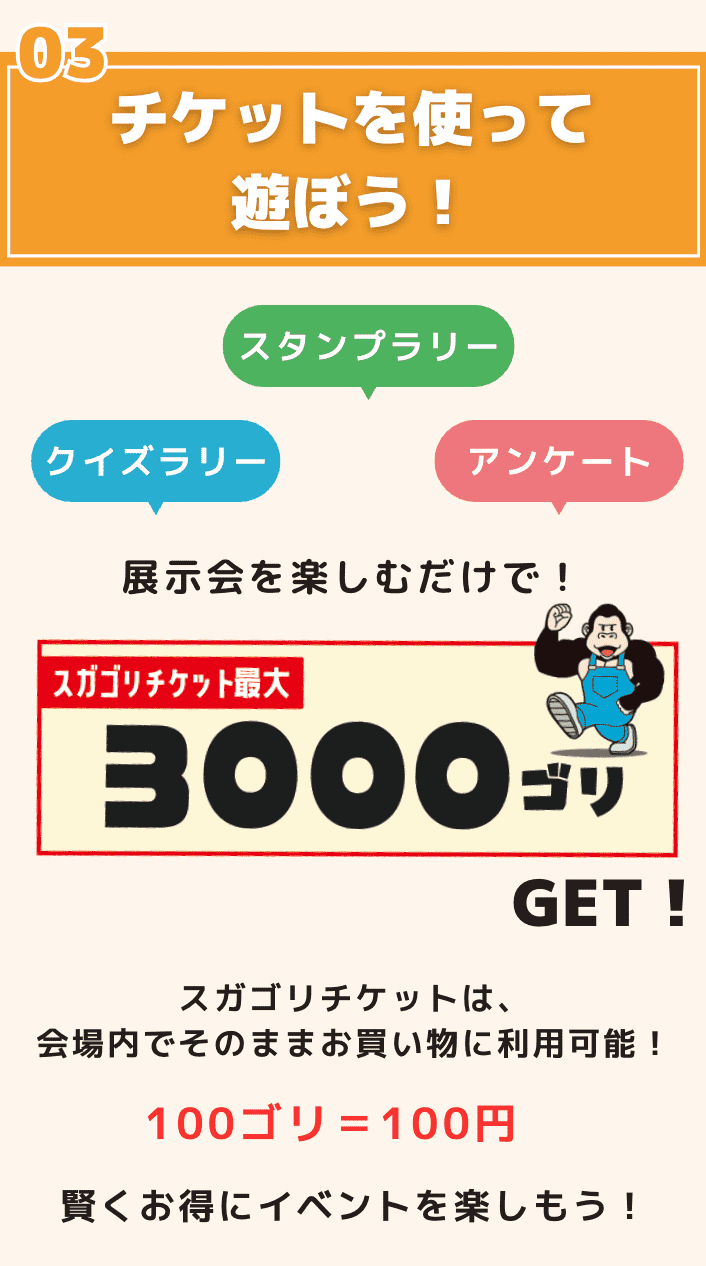 1組につき、最大3,000ゴリです。4人1組で来場の場合も、もらえるチケットは最大3,000ゴリとなります。